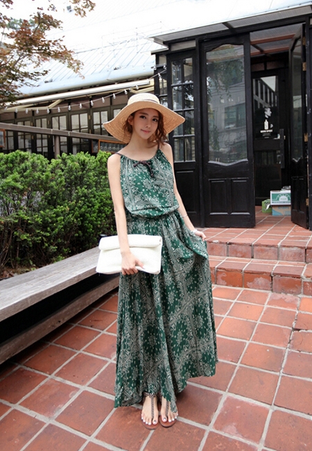 民族风印花吊带长款连衣裙+民族风夹角凉鞋+白色手拿包+遮阳帽