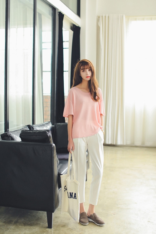 搭配看点:粉色T恤搭配白色阔腿裤显得休闲随意,很有潮人风尚,配上舒适的懒人鞋,恣意慵懒。或者选择白色小脚裤,将库脚挽起,也能轻松穿出清新夏日风情。