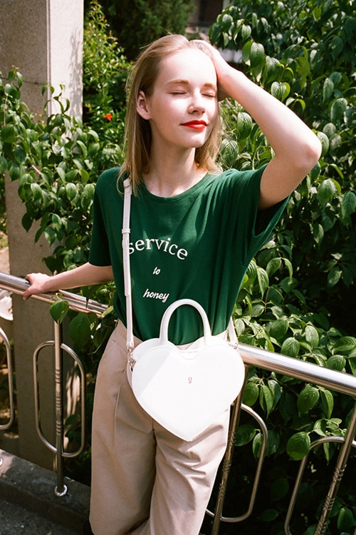 搭配三:绿色T恤+浅色下装+斜挎包
