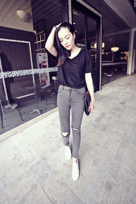 搭配三:黑色T恤+灰色裤子