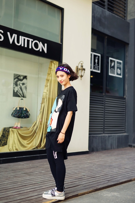 搭配看点:黑色搭配黑色显瘦功力一流,尤其是宽松的黑色T恤搭配紧身的黑色裤子轻松满足高逼格和显瘦双重需要。如果担心造型过于沉闷,在黑T的选择上可以考虑融入白色字母或浅色印花图案的款式,或者在配饰上选择浅色的单品,比如白色包包、浅色发带等,来提亮造型色彩。