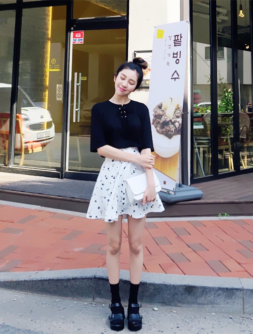 搭配看点:黑色T恤搭配白色碎花短裙很有学院少女气息,再选择一款清新的白色手拿包,将清纯进行到底。