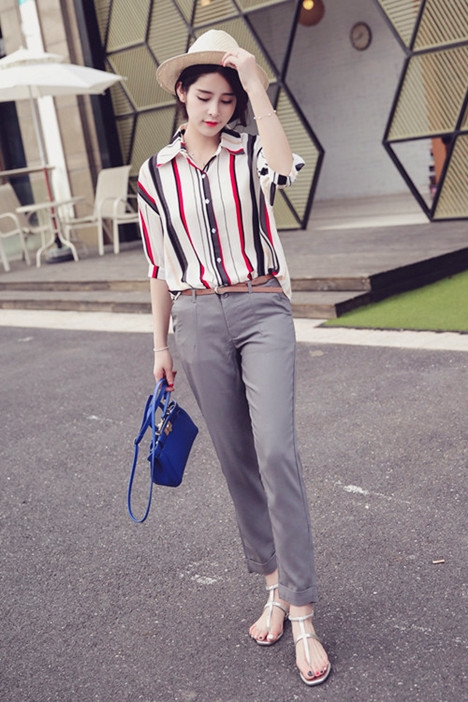 搭配看点:灰色哈伦裤知性优雅,配上都市气息十足的红白色系竖条纹衬衫,轻松提亮造型色彩。再加上清凉舒适的平底凉鞋和时尚编织礼帽,分分钟穿出清新夏日风情。
