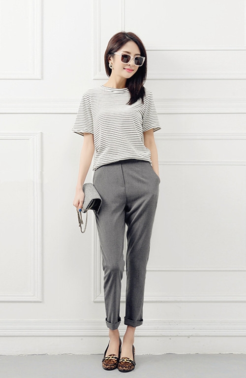 2、灰色哈伦裤搭配清新的条纹上衣很有学院气息,也十分推荐,或者选择淡雅的印花衬衫,轻松穿出知性女人魅力。