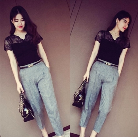 灰色哈伦裤+黑色蕾丝上衣+腰带+手提包