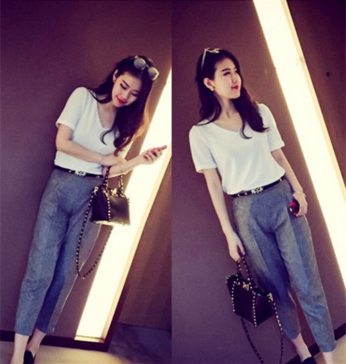 搭配看点:灰色哈伦裤将裤脚卷起也别有时尚韵味,搭配灰白T显得婉约淡雅,最吸睛的还是那款mini灰色链条包,精致贵气又不失时尚气息,极具轻熟女魅力。