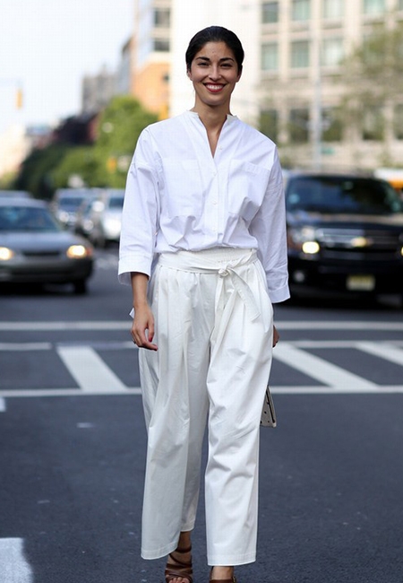 大胆尝试一身白色看上去很有挑战性,要注意的是太过规矩的白色衬衫款式很难穿出随性的感觉,建议选择不翻领的V字款搭配有腰带修饰的长裤,搭配出随性自然的大牌范儿轻松搞定。
