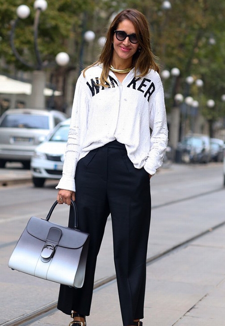 阔腿裤也是跟白衬衫搭档的绝好单品,事实上并不是纯白色的衬衫才是百搭的利器,带有字母LOGO或简单线条的款式更能凸显你的时尚品味。