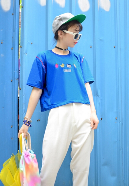 夏天的彩色系,颜色很亮,超级卡哇伊的刺绣小小图标,比印花的更Q,衣服是偏短款的,很百搭,简单搭配白色休闲长裤都很吸睛的哦,搭配白色框墨镜俏皮感出来啦。