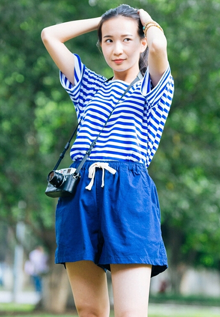 蓝色经典海魂衫搭配同色系短裤将衣服扎进裤子里,视觉色系很统一,学院风十足,日系小清新。