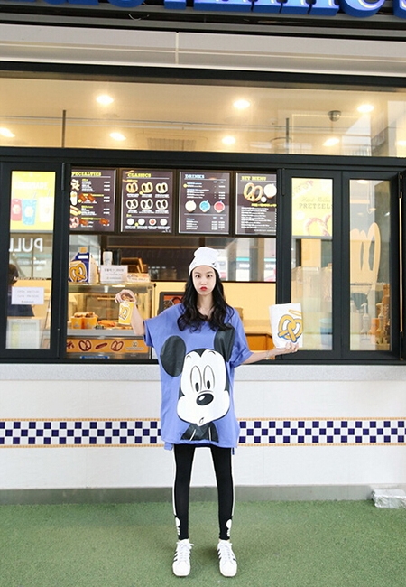 可爱的超人标志设计,青春活力,运动风十足!直身的版型,能非常好的修饰身材!搭配灰色休闲运动短裤,和白色平底鞋,显得休闲随意看上去很亲肤。将头发扎起十分精神。