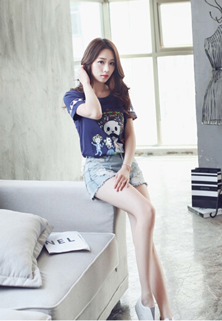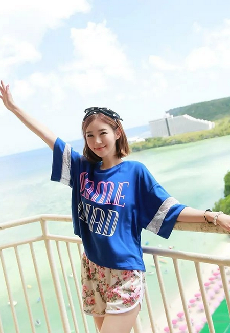 宽松蓝色字母蝙蝠T恤搭配宽松碎花短裤很适合在家里穿着,比普通家居服看上去会更加有美感,再加上黑白色发箍,让你在家里也美美的拥有夏天的味道。