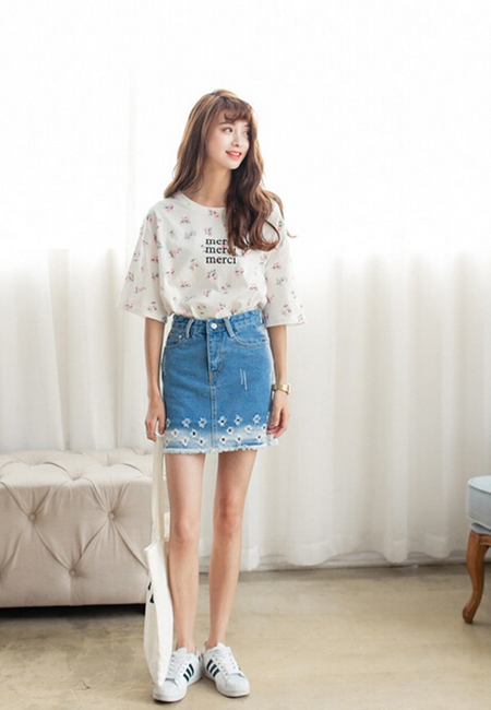 今夏流行的碎花衣+简单的牛仔高腰短裙,配上白色的运动鞋,一身清爽的夏日装扮就搞定啦!高腰不会显得腿部粗壮,还能拉长腿部比例,简直是小粗腿妹子的福音。