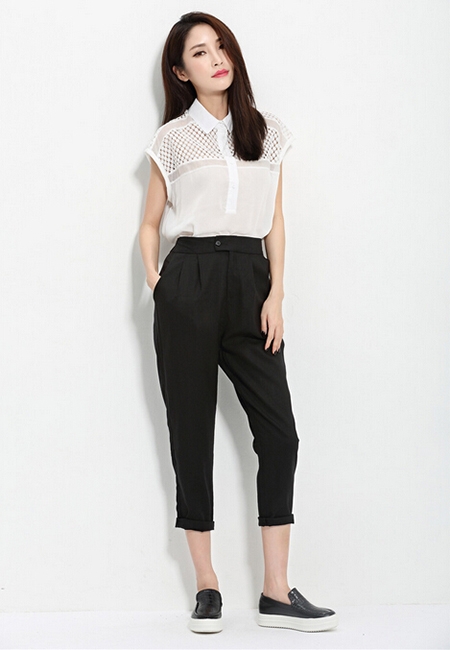 白色网纱上衣透露小性感,搭配黑色宽松卷边裤将视觉拉高,和黑色懒人鞋,黑色搭配很显瘦哦,有没有那么一丝慵懒的韩范,穿这身去喝下午茶最合适不过了。