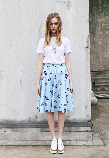 蓝色印花百褶裙+白T+白色松糕鞋