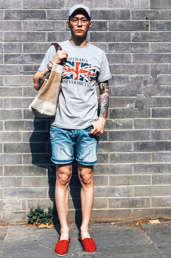 LOOK 8:灰色T+牛仔短裤+红色懒人鞋+鸭舌帽