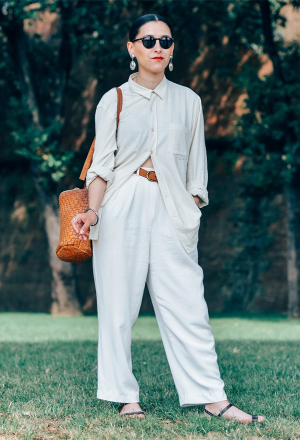 LOOK 1:白色无袖衬衫+白色阔腿裤+尖头鞋+墨镜