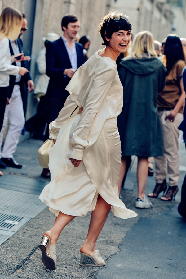 LOOK 4:米白色露背丝质连衣裙+米色坡跟鞋