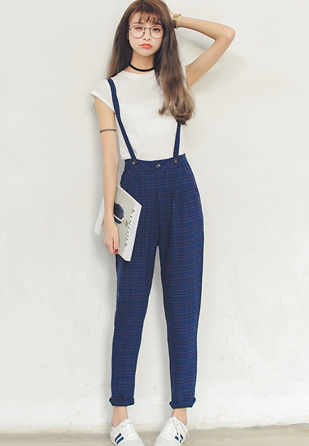白色短T+蓝色哈伦背带裤+白色板鞋