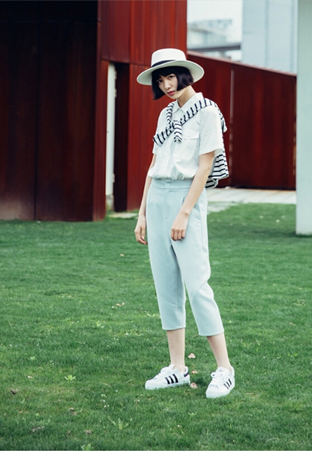 淡色中袖衬衣+薄荷绿哈伦裤+白色板鞋