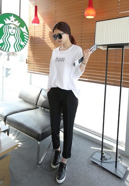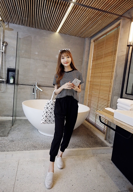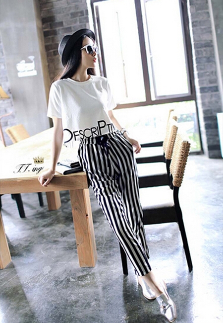 恤选择条纹黑白色哈伦裤,上衣一定要搭配同色系,这样才会显得有高级感。清爽,帅气,,黑白搭配永不过时,这样搭配套装完全做到气质与实用并存。