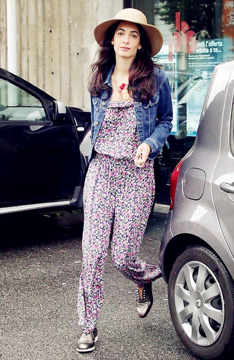 OL穿衣搭配 LOOK 7:印花吊带连体裤+牛仔外套+宽檐帽