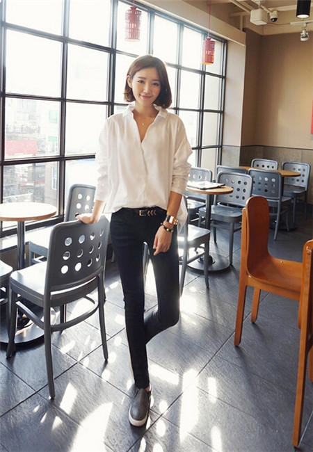 宽松衬衫+黑色紧身牛仔裤+黑色皮质平底鞋