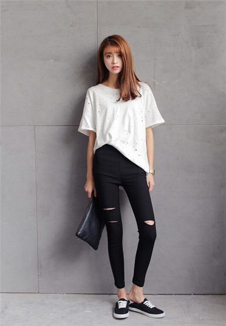 宽松T恤+破洞牛仔裤+黑色手拿包