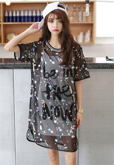 在选择服饰的时候,要在身材缺陷的地方进行过多的修饰。可以通过一些抢眼的小细节转移视线,这件连衣裙透视网棉材质,绚丽的不规则波点印花,色彩斑斓,字母图案印花,时尚休闲的一款,完美的避开了肩宽的问题。