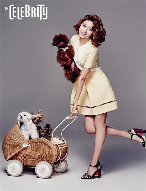 鹅黄色连衣裙搭配性感的高跟鞋,崔秀英变身俏皮可爱的宠物控。