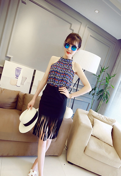 无袖印花上衣+黑色流苏裙+墨镜+草帽