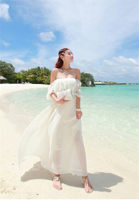 露肩的一字领总是那么迷人,无论出海或者晚宴,沙滩漫步都适合的一条长裙哦!不想太过度假风,搭配一个白色手拿包,都市感马上UP!