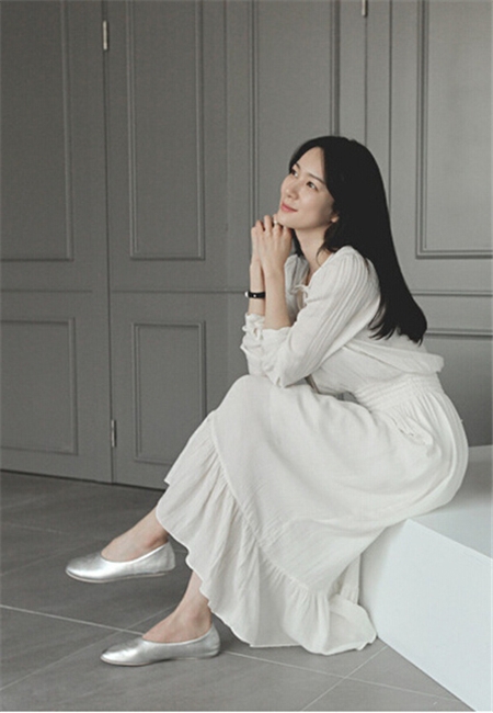 纯色长款大裙摆的连衣裙搭配银色浅口平底鞋,看上去很舒服哦。平底鞋是造就女神范的必备单品。