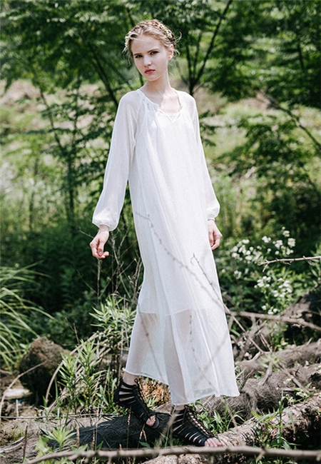 纯色雪纺长袖连衣裙两件套内搭及膝盖,外网纱及脚踝,搭配黑色平底凉鞋好有灵气。