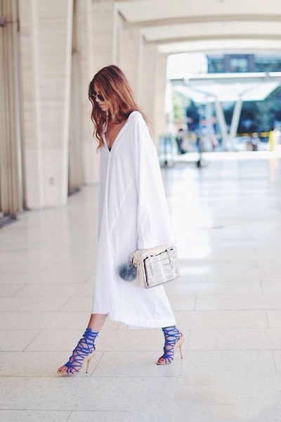 白色V领连衣宽松长裙+白色手拿包+蓝色罗马高跟鞋