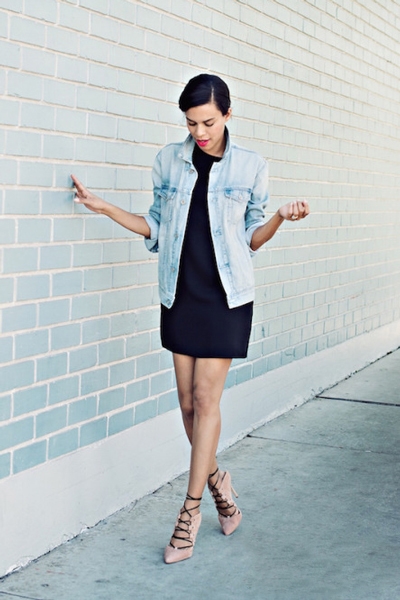 黑色连衣短裙+牛仔外套+尖头罗马高跟鞋