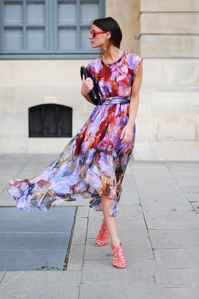 印花雪纺长裙+虾红色罗马高跟鞋+黑色手拿包