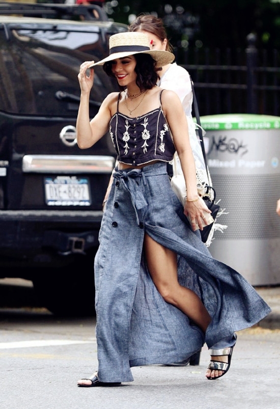 搭配看点:名族风气息的吊带上衣搭配斜开叉复古牛仔半身裙,简约清爽又不乏时尚气质。戴上优雅的宽檐帽,变身气质名媛。矮个子女生可以大胆尝试哦,最重要的就是一定要选择高腰款式,同时上装选择简单清爽的吊带上衣或其他短上衣就好,配饰上选择一款mini链条包,一顶宽檐帽或一款精致的项链就更加起范儿了。