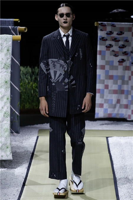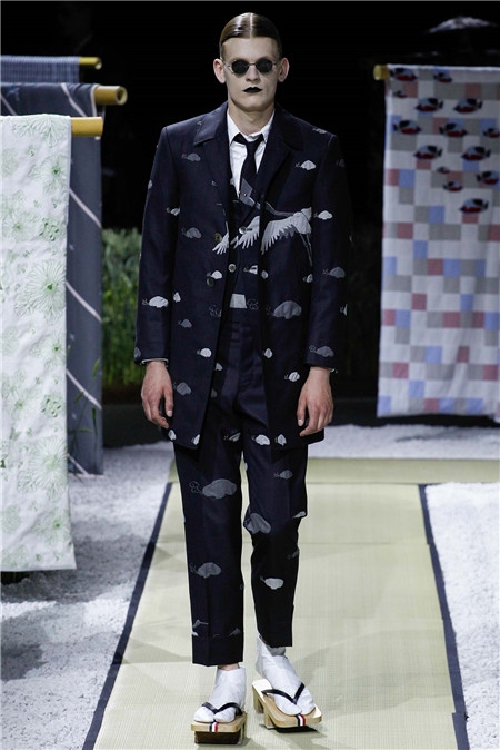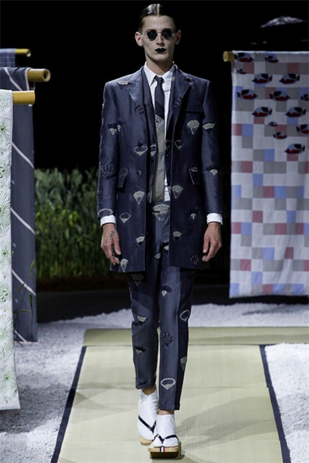 由于中国的服饰展布朗的思维方式也开始转向东方,他的目光落在了日本上,一个对细节有着别样偏爱的国家,这个国家的工匠值得所有人尊重,他们将自己的精神和对工艺的激情紧密的结合在一起给布朗提供了前所未有的灵感,他用编织羊毛在西装上打造着和传统同步但又突破传统的和服纹饰。
