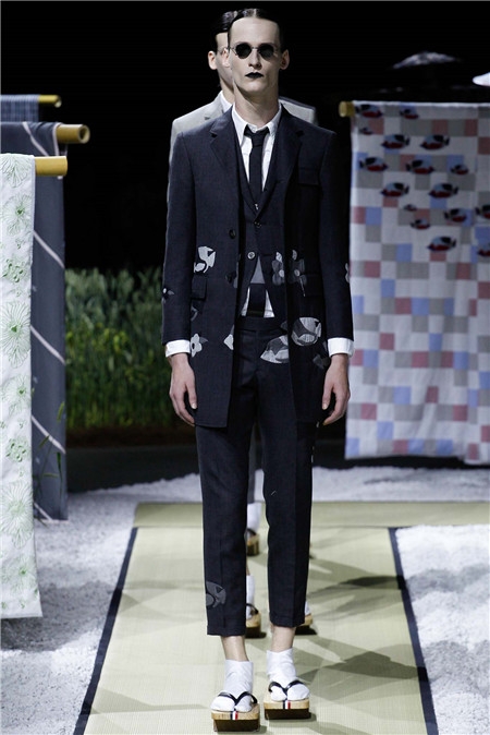 汤姆?布郎(ThomBrowne)2016春夏男装发布,巧妙使用和风元素,妆容复古服装充满着浓郁的文化冲撞感。