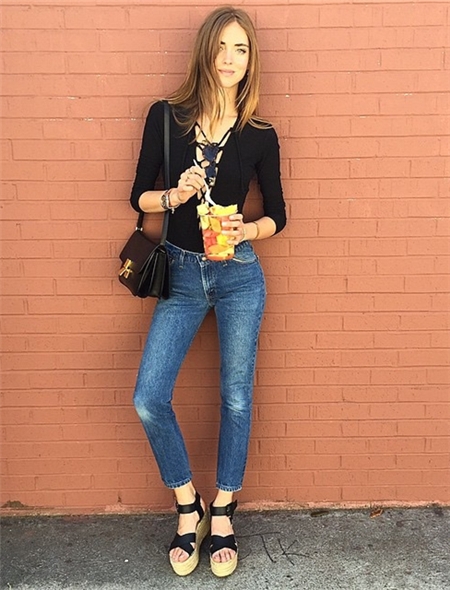 示范搭配一:黑色绑带T恤+蓝色牛仔裤+黑色挎肩包+松糕凉鞋