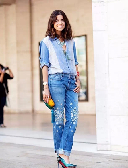 示范搭配一:白间蓝条纹衬衫+蓝色花纹牛仔裤+蓝色涂抹风红底饰高跟