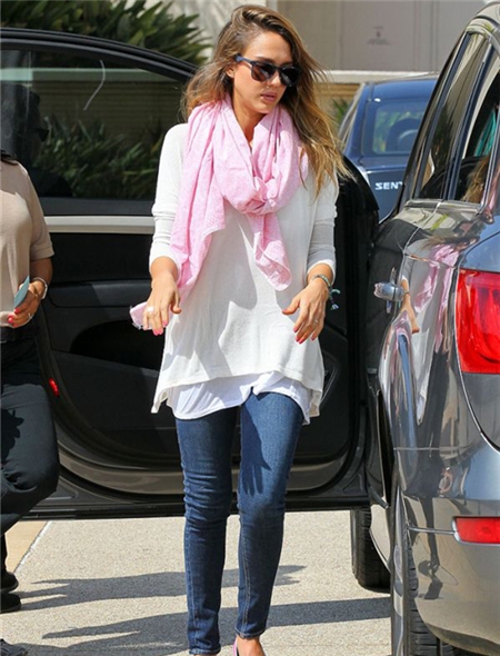 示范搭配二:白色上衣两件套+蓝色牛仔裤+粉色围巾