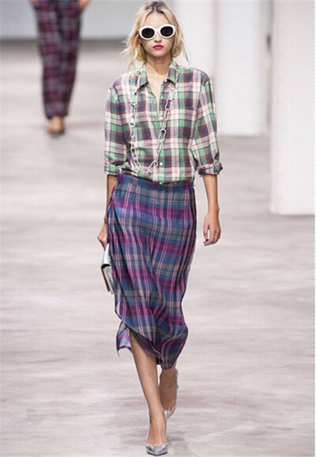 格子裙罕见的搭配格子衬衫,不同的感觉风格,搭配细尖高跟鞋露出小半截小腿,微胖的女生也会合适穿,拉长腿型哦。