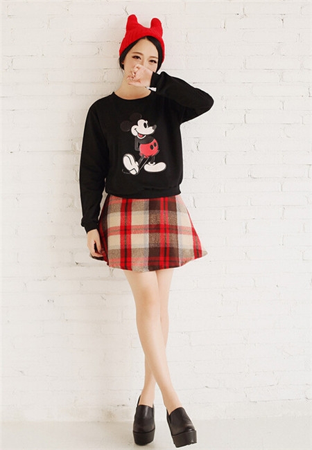 黑色套头卫衣搭配红色格子裙,红黑搭配很保险,可爱的米老鼠印花卫衣,在鞋子上选择黑色松糕鞋,这样的搭配保证你年轻十岁。