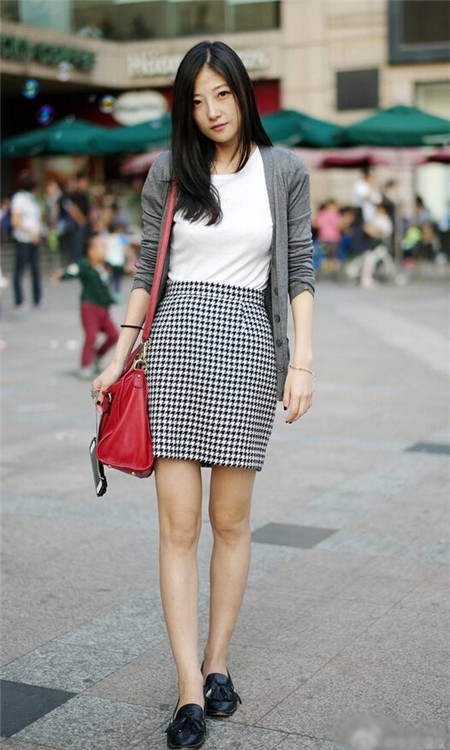 黑白格子高腰包臀裙很有质感,如果一天上班时间都穿着高跟鞋很累,也可以选择有质感的黑色平底鞋,上班深搭配紧身一点的Y恤更加能显身材哦。
