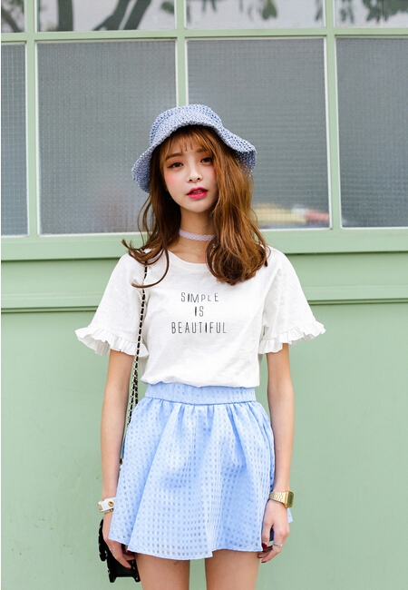 简约字母印花T恤口荷叶边设计,又集合字母印花的简约气与潮流范,甜美也很时髦。轻薄飘逸。裙裙穿起来蓬蓬的感觉,非常好看。