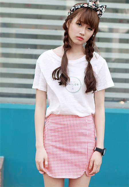 红白格子的包臀裙,超美的开叉设计,搭配白的T恤,将头发绑成辫子带上碎花头箍,复古和小清新的结合。