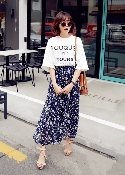 白色T恤搭配什么裙子 LOOK 1:雪纺印花长裙