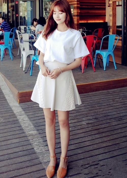 搭配看点:白色T恤搭配白色裙子或白色系裙子显得十分清纯,鞋子选择与发色一致的色彩更加耐看,也给人统一的视觉美感。